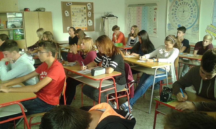 Žáci štěnovické školy vyplňují při výkladu kvízové otázky