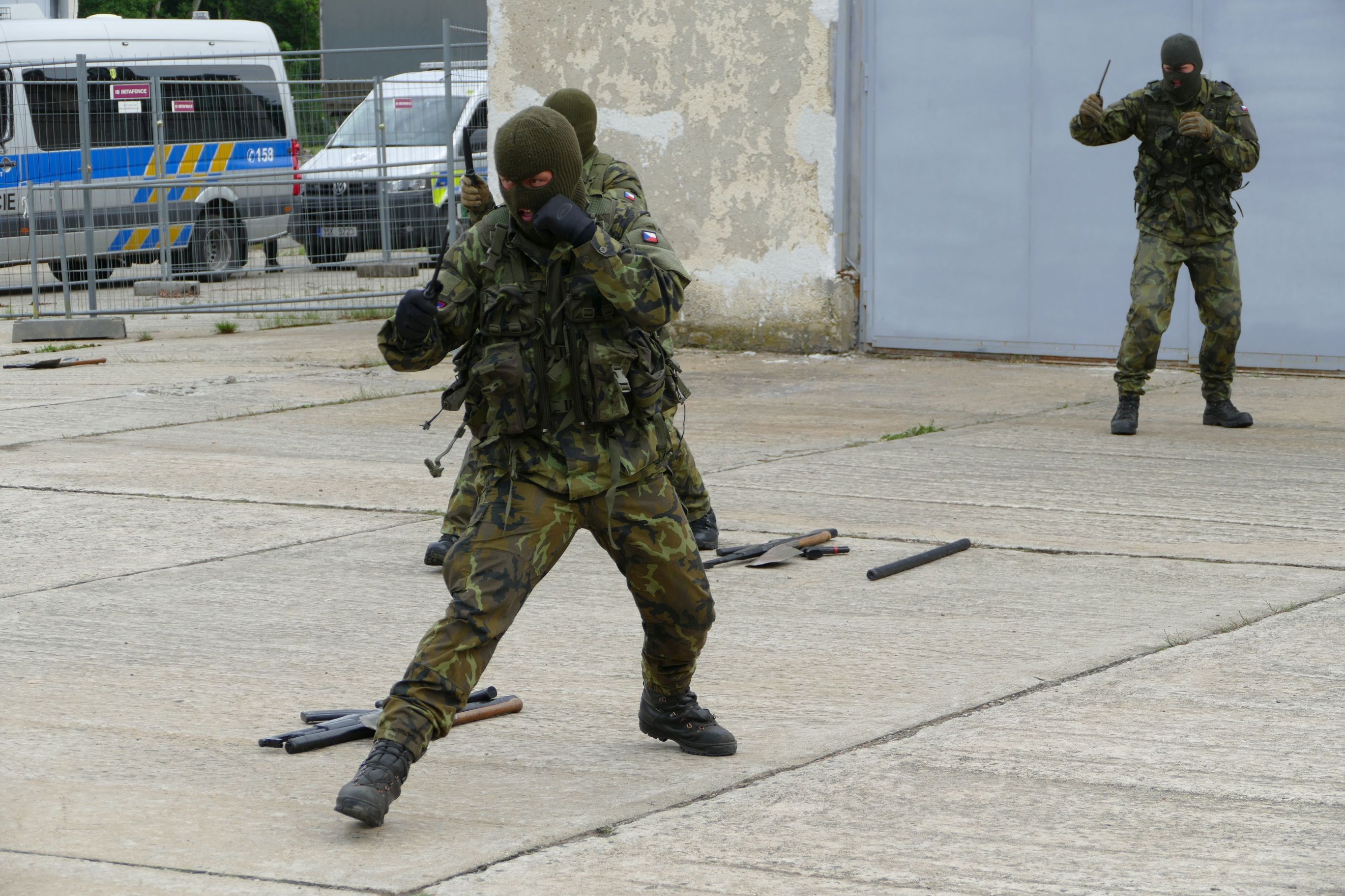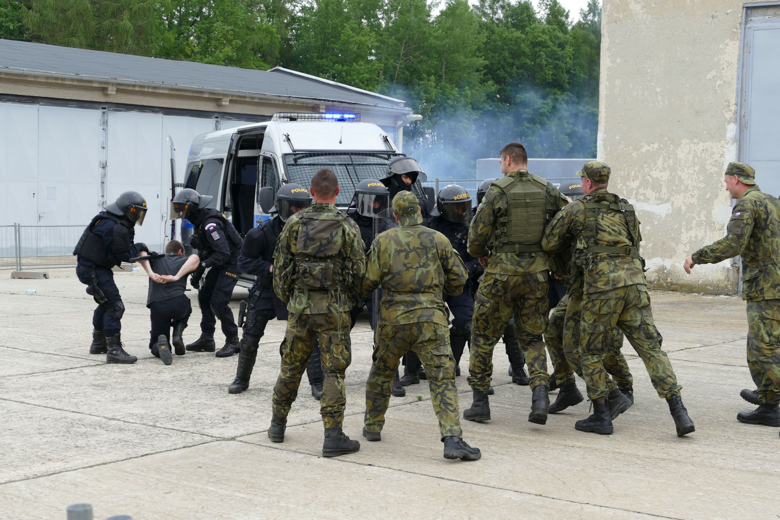 Zcela na závěr proběhla ukázka postupu pořádkové policie proti agresivním výtržníkům. Roli desperátů sehráli místní dělostřelci. Na místo dorazilo zásahové vozidlo středočeské policie. Skupina těžkooděnců zahájila předepsaný postup eliminace agresivní tlupy. Použila k tomu kromě donucovacích prostředků také pyrotechniku se zvukovými efekty. Následná potyčka přinesla velké překvapení. Děti shromážděné kolem prostoru ukázky nepochopily, že vojáci jsou v tomto případě na špatné straně a začaly je skandováním podporovat proti zasahujícím policistům. Ti se však nedali zmást. V klubku výtržníků záhy nalezli vůdčí osobnost. Provedli jeho zajištění a akci dovedli do úspěšného konce.