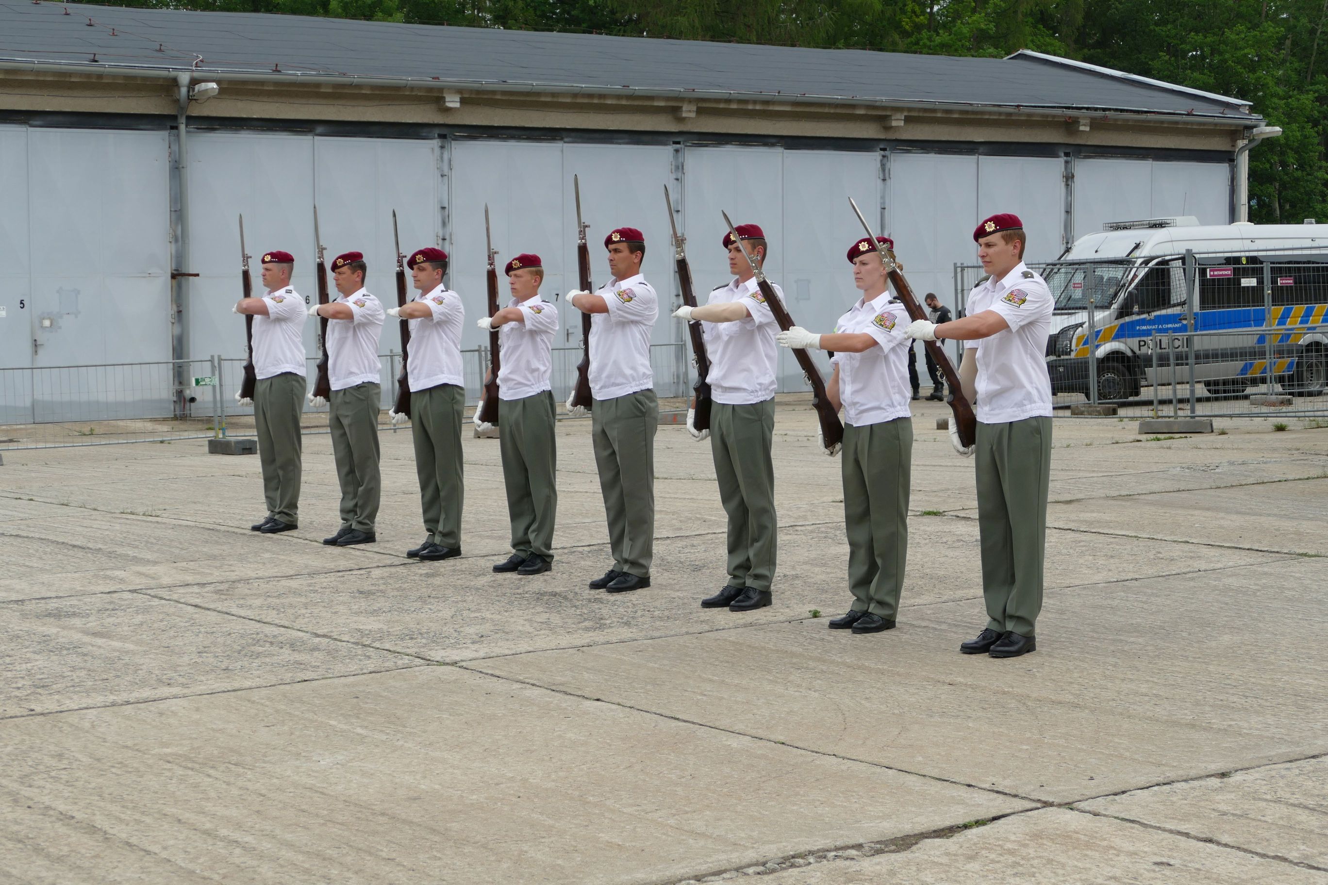 Vojáky v maskáčích vystřídala čestná jednotka. Kdo by se domníval, že umí jen vybroušený krok, mýlil by se. Její skvěle provedené cvičení se zbraní, za doprovodu stylové hudby, vyvolalo nadšení diváků.