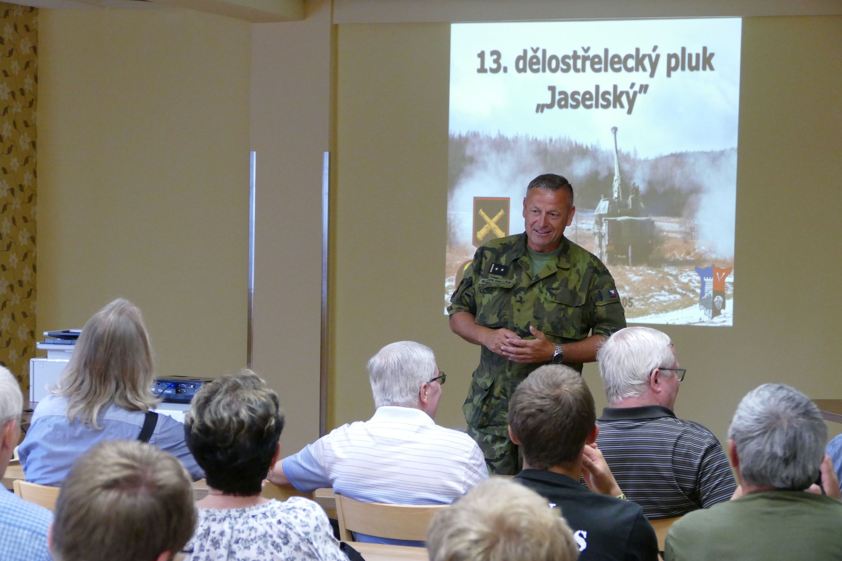 Po společné cestě autobusem z Plzně do Jinců, byli studenti školy nejprve přivítáni členy plzeňského klubu ČaSOD. Poté následoval přesun do sálu místního posádkového domu. Zde k studentům pronesl na úvod krátkou řeč velitel útvaru, pan plukovník Ing. Ivan Mráz, Ph.D. Pana plukovníka vystřídal vzápětí náčelník štábu 13. dělostřeleckého pluku, podplukovník Ing. Roman Smolka. Seznámil přítomné s informacemi o organizaci, výzbroji a úkolech pluku. Načrtl očekávaný plán na přezbrojení moderní technikou. Posluchače zaujalo také porovnání výkonů našich dělostřelců s dělostřelci jiných států NATO, například USA. Kanonýři AČR pracují sice s generačně rozdílnou technikou, ovšem i tak dokáží dosahovat srovnatelných výsledků. Uvedl několik detailů o parametrech zaměřovacích systémů používaných útvarem.