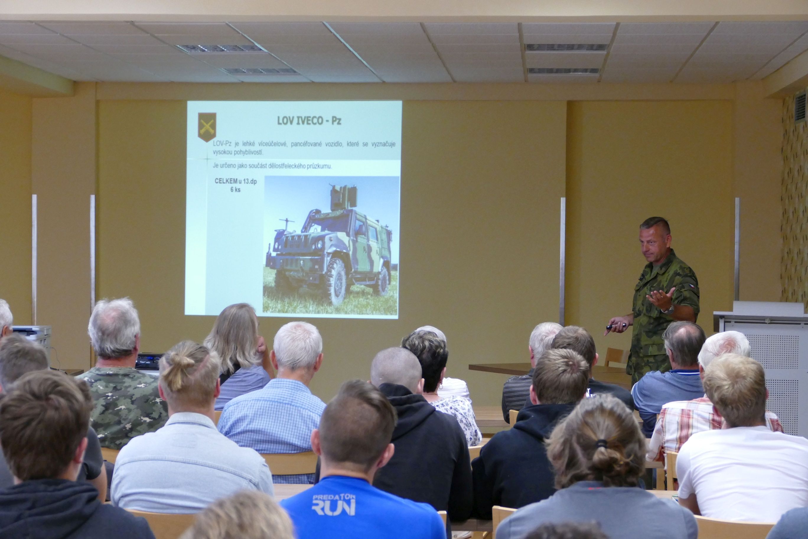 Neopomenul informovat o roli aktivních záloh a způsobu jejich bojové přípravy. V jeho prezentaci samozřejmě nechyběla část o zahraničních misích. Zmínil se také v krátkosti o tom, jak se stát profesionálním vojákem dnešní AČR. V průběhu prezentace byl studentům rozdán soutěžní lístek s kvízovými otázkami o hodnotné knihy, které sponzorsky zajistily Vojenské Investiční Medaile. Následně se celá skupina přesunula autobusem to technického parku pluku. V jeho areálu probíhal kombinovaný program AČR, Policie, čestné stráže AČR a složek IZS. Program byl přístupný pro další školy, proto se kolem techniky pohybovalo větší množství dětí s doprovodem učitelů. Ústřední roli hrály samohybné houfnice 152 mm ShKH vz. 77 DANA, tvořící hlavní dělostřeleckou výzbroj pluku.