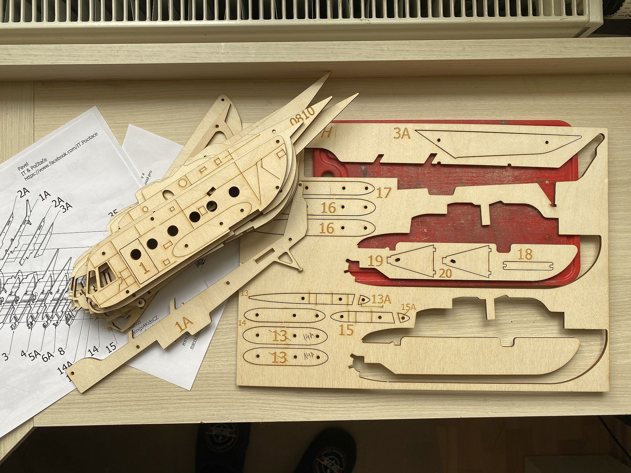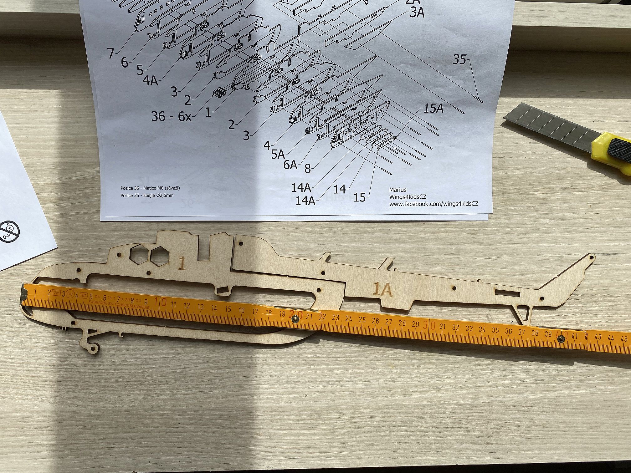 Stavebnice je dodávána v rozměrné krabici s akčním obrázkem. Uvnitř najdete pět desek stavebních dílů. Mi-17 jich má rovnou 60. Fakticky je to o jeden díl víc, protože hlavní rotor má jeden list náhradní. Místo pěti šest. Součástky jsou přesně vyřezány laserem. Základním materiálem je kvalitní březová překližka o tloušťce 3 mm. Už to samo o sobě dává tušit, že finální model bude přece jen trochu větší. Výrobce dále přidává závaží. Jeho účelem je zajistit, aby vrtulník nepadal na ocas. Závaží vyřešil kreativně použitím šesti kusů matic M8. Další příslušenství tvoří špejle o průměru 2,5mm a truhlářský kolík. Jak je u stavebnic zvykem, nechybí návod a kontakt na výrobce.
