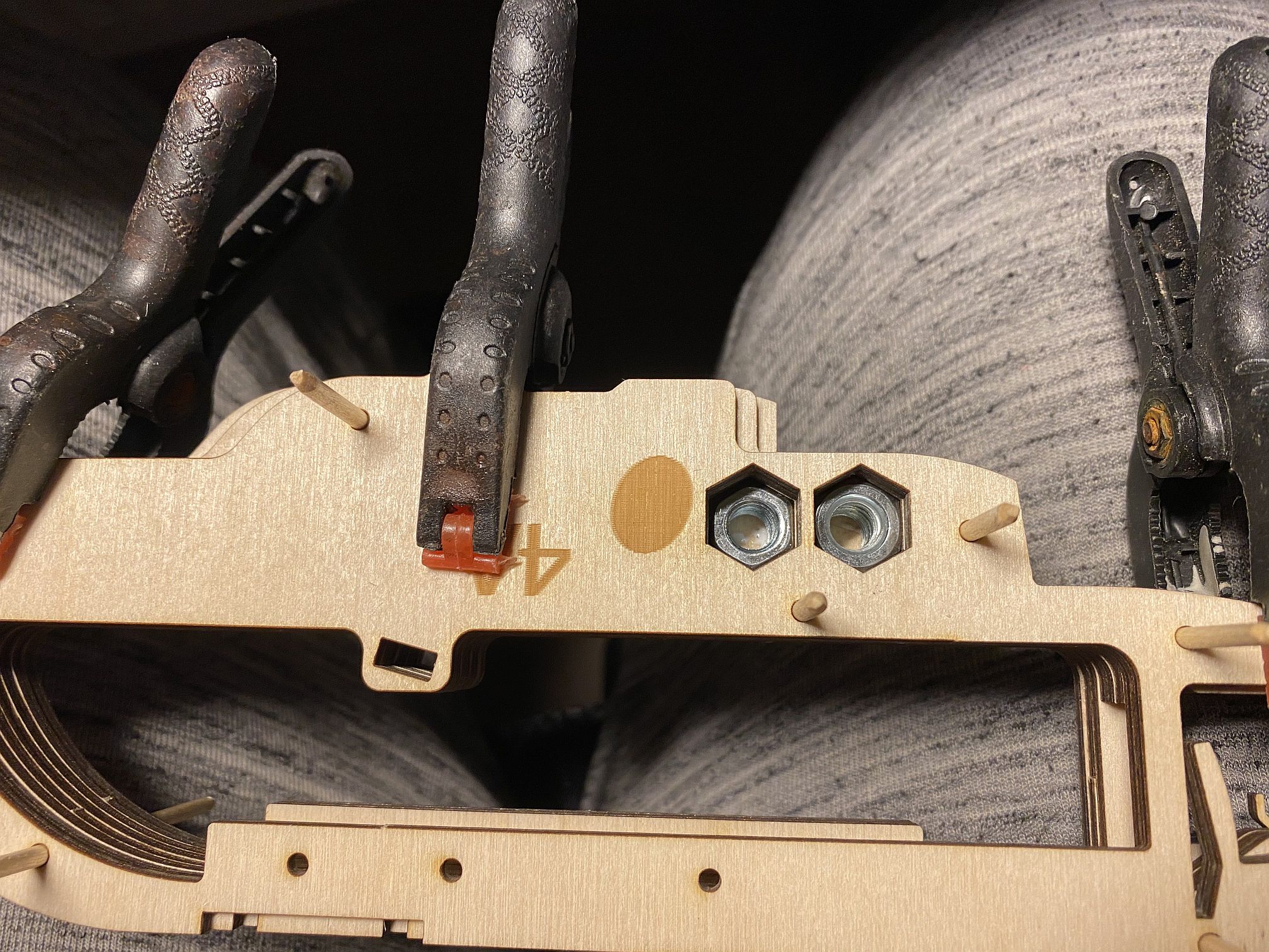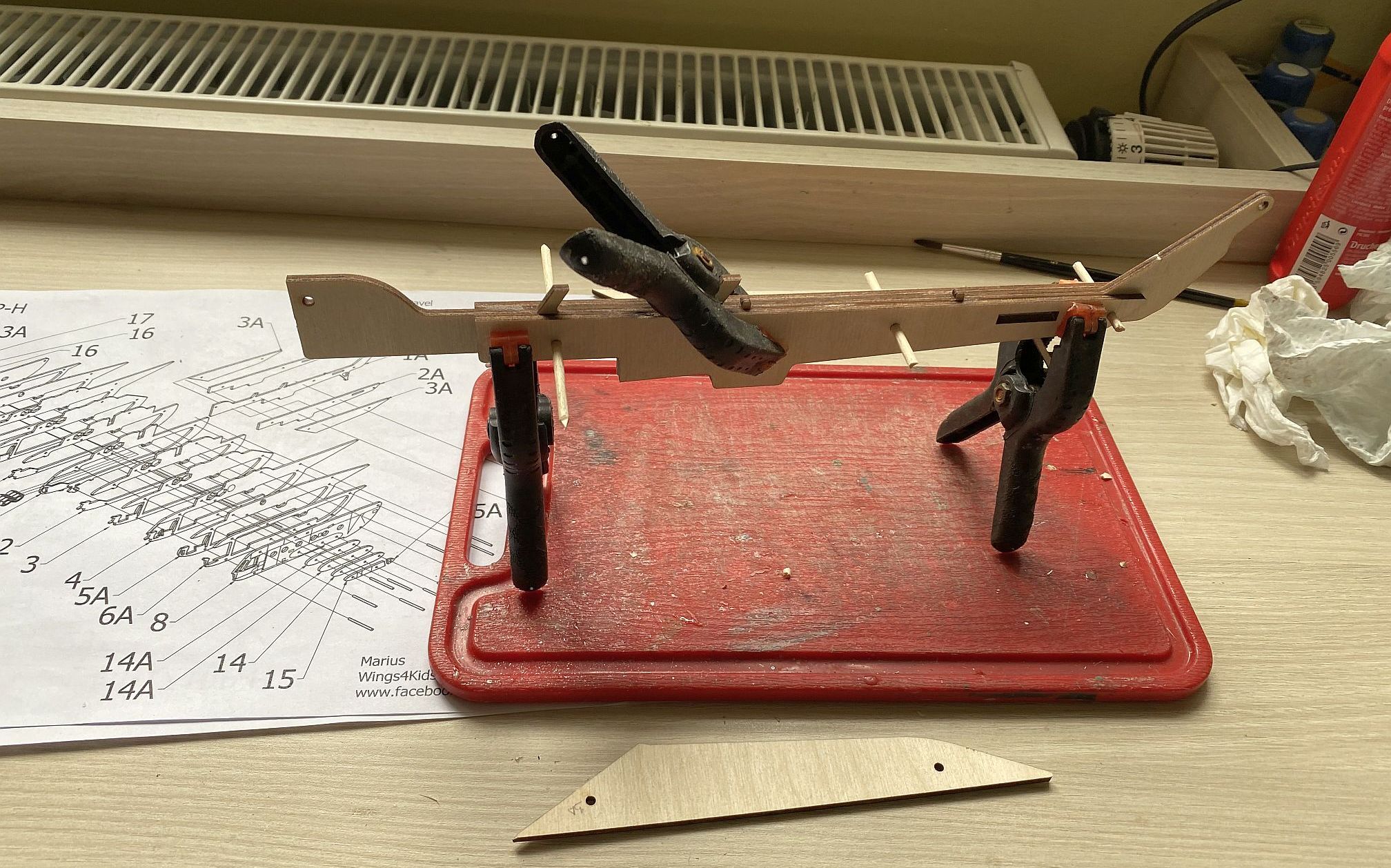 Díly jsem přidával vždy po páru a složenou sestavu po nanesení lepidla vždy stáhl truhlářskou svěrkou a nechal cca 10 min zavadnout. Mezi tím došlo na přípravu dalších dílů. Ostrý nůž pro vyřezávání je naprostou nutností. I tato fáze musí být vykonávána opatrně. Překližka se může při nevhodné manipulaci odloupnout. Hrbolky po vyříznutí z rámečku se dají na dílech zahladit. S ohledem na zvolenou technologii výroby budou však viditelné. U této formy modelu je to přijatelné.