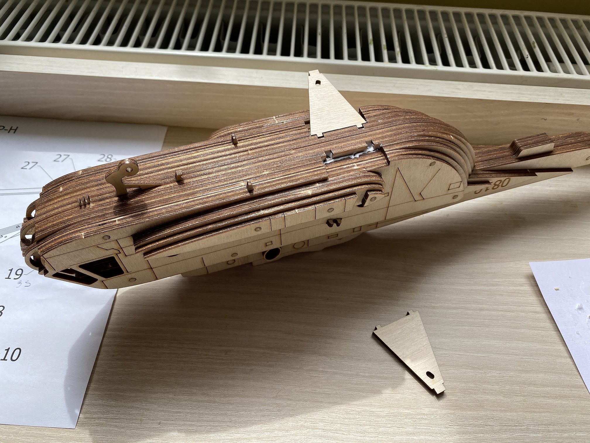 Dále to šlo docela rychle. Trup se skládá z několika rozměrných dílů. Je potřeba přesně dodržet postup. Do prostoru pod gondoly motorů se vkládá závaží – matice M8. Další díly tento prostor uzavřou. Nelze proto závaží dodatečné vložit. Opomenutí tohoto kroku bude mít pro model fatální následky neb začne padat na ocas. Přidávané díly postupně vymodeluji exteriér i interiér. Kabina disponuje lavicemi pro cestující po obou stranách. Kokpit má detaily, jako například sedačky pilotů, přístrojové panely a ovládací páky. Dveře do stroje lze udělat otevřené či zavřené. Vzhled detailů je poplatný použité technologii. Osobně je vnímám jako povedené. Trochu problematičtější jsou již zmíněné středící koliky. Bez nich sestavit model správně nejde. Bohužel práce s nimi není vždy intuitivní. V návodu vypadají jako průchozí, nicméně jsem narazil na několik kusů neprůchozích. Pro toho, kdo se rozhodne postavit model jen za pomoci přiložených špejli bude rozpočítávaní materiálu poměrně náročné.