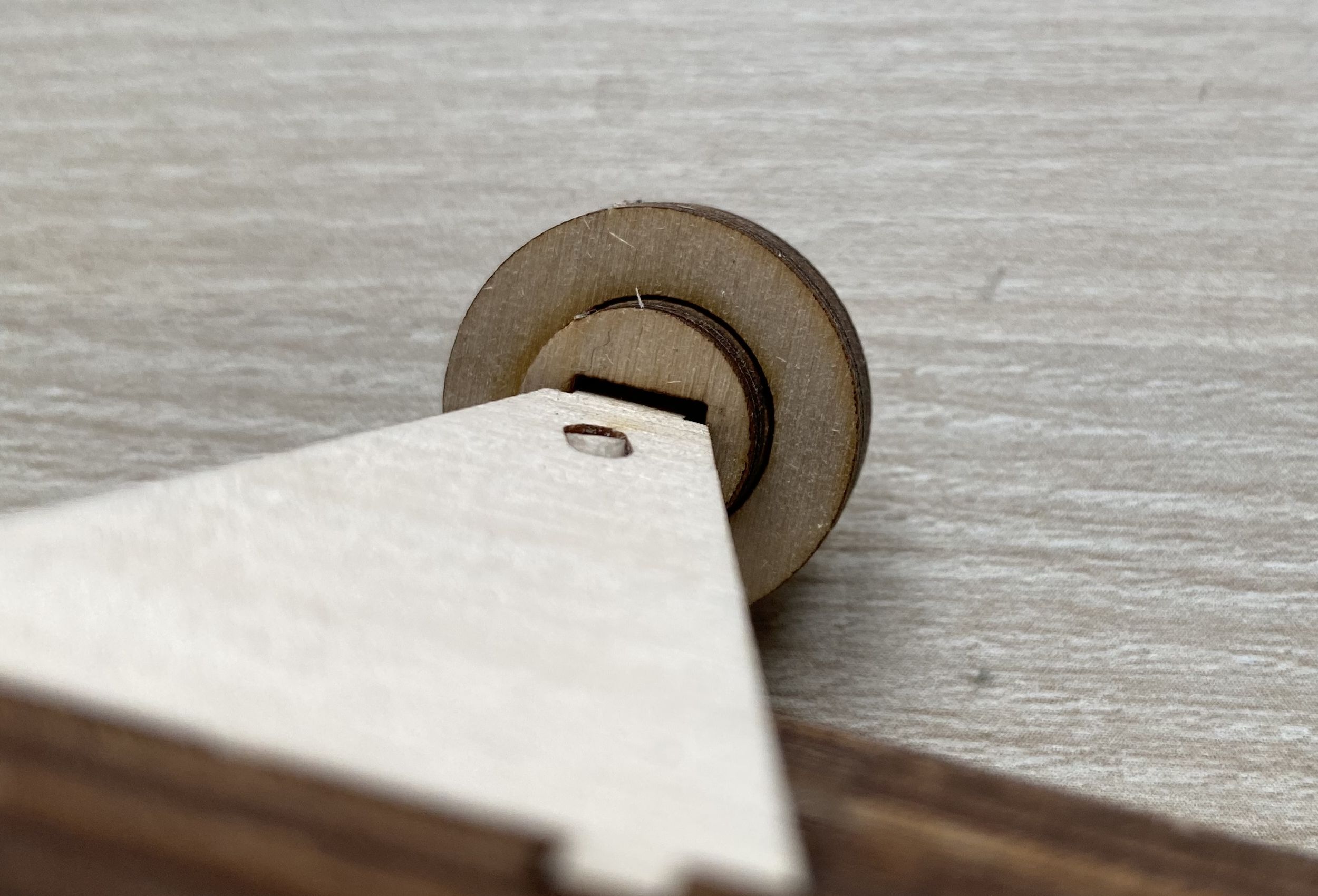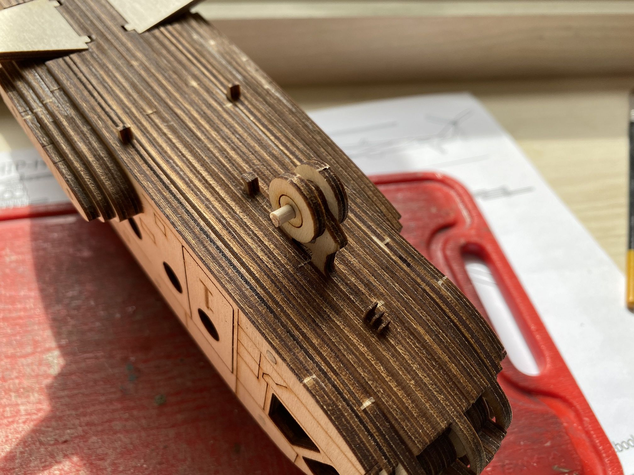 Skutečným úskalím jsou kola. Otvor v nich je větší než související díl. Kolo tak na dílu vysloveně plandá. Po přilepení sedí kolo jen na malém kousku. Relativně pruží. Jenže dle mého názoru je pravě tento spoj velmi rizikový a při nevhodné manipulaci hrozí upadnutí kola. Docela protiklad k celkové robustnosti celé sestavy podvozku. Pomohl jsem si vlepením destiček z párátek, čímž došlo k vyplnění chybějícího prostoru. Tím se výrazně zvýšila tuhost.