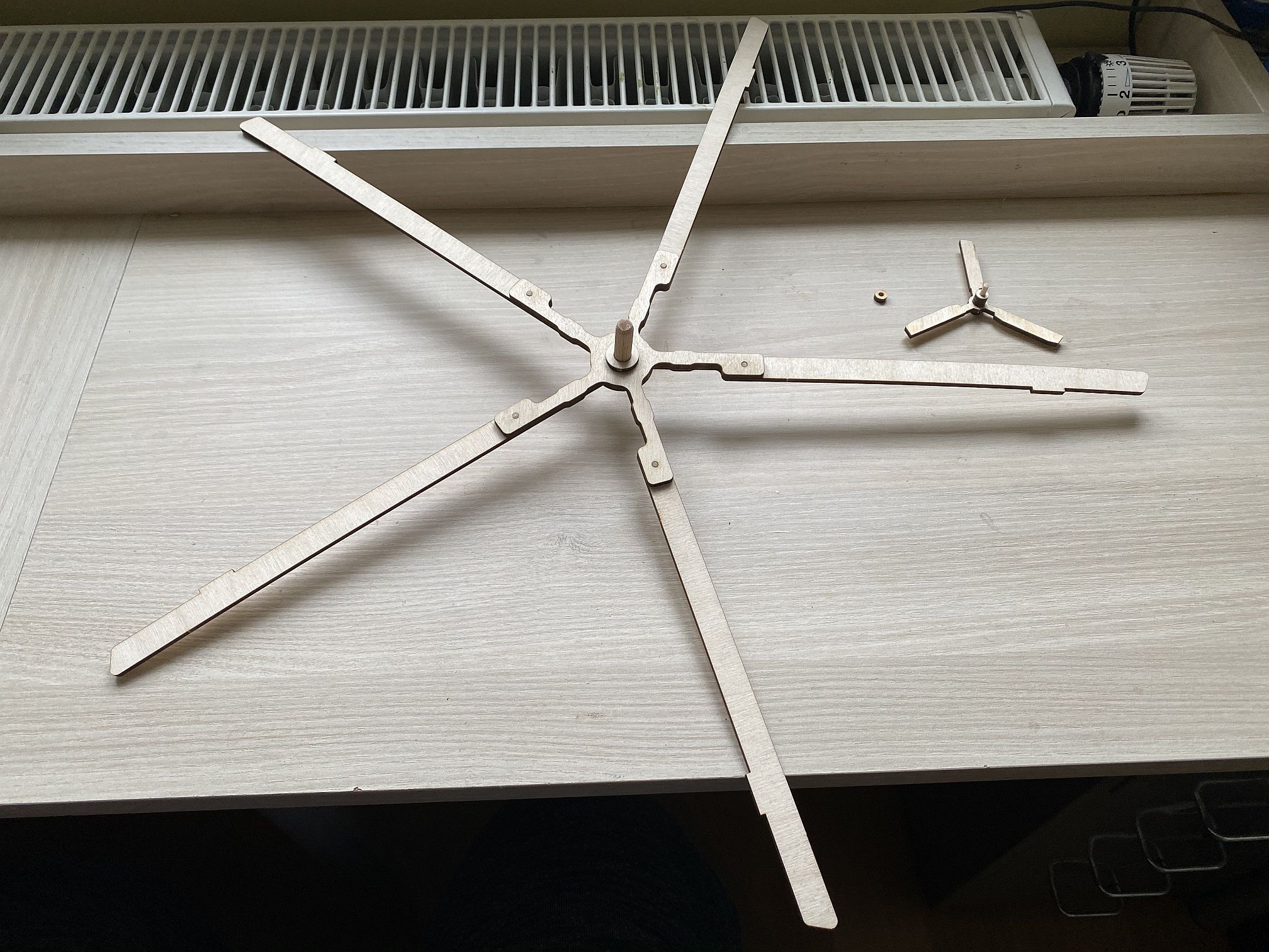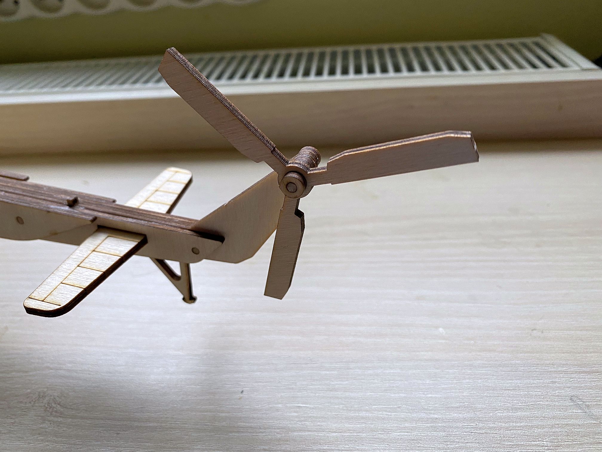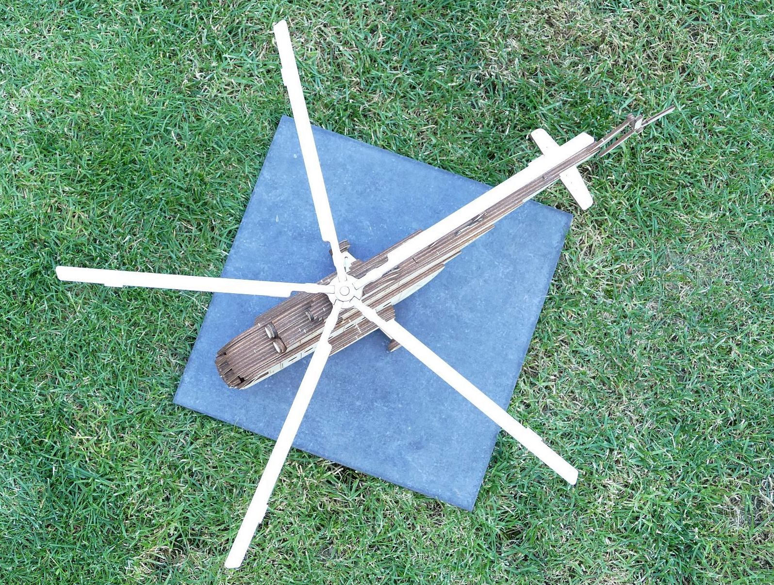 Finálovou disciplínou se stalo sestavení a instalace vrtulí. Zadní rotor byl raz dva. Navíc může být osazen z obou stran, což dává prostor k jednoduché konverzi na Mi-8. Hlavní rotor je trochu výzva. Významnou roli hrají opět středící kolíky. Při prostrkávání jednoho se mi podařilo odloupnout kousek povrchu vrtulového listu. Naštěstí stavebnice obsahuje díl navíc. Tento rotor sám o sobě představuje nejrozměrnější sestavu. Mohl bych dodat, že zároveň nejnáchylnější na zničení. Do modelu se usadí za pomoci klasického truhlářského kolíku.