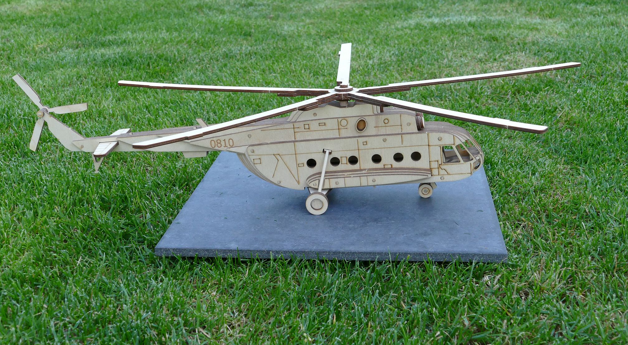 Model v měřítku 1:43 věnovaný Mi-17 je poměrně netradiční. Místo plastikové stavebnice se jedná o stavebnici z dřevěných dílů. Vyrábějí se vypalováním laserem, jsou tedy poměrně přesné. Vrtulník je opravdu ve 3D, včetně interiéru. Díky použitému materiálu se nepředpokládá kamufláž. Provedení dílů ztvárňuje detaily v možnostech zvolené technologie. V mém případě mi výrobce - Wings4KidsCZ - vyšel vstříc ohledně označení. Model proto představuje konkrétní stroj trupového čísla 0810 (v. č. 108M10), který měl v roce 1991 domovskou základnu na letišti Plzeň-Bory u 11.vrtulníkového pluku, 3 letky. Do služby byl zařazen 20.9.1985. Třetí letka měla tři roje, celkem dvanáct helikoptér. Proč jsem zvolil zrovna toto označení? Odpověď je prostá. Mám fotografie této helikoptéry ve svém osobním archivu.