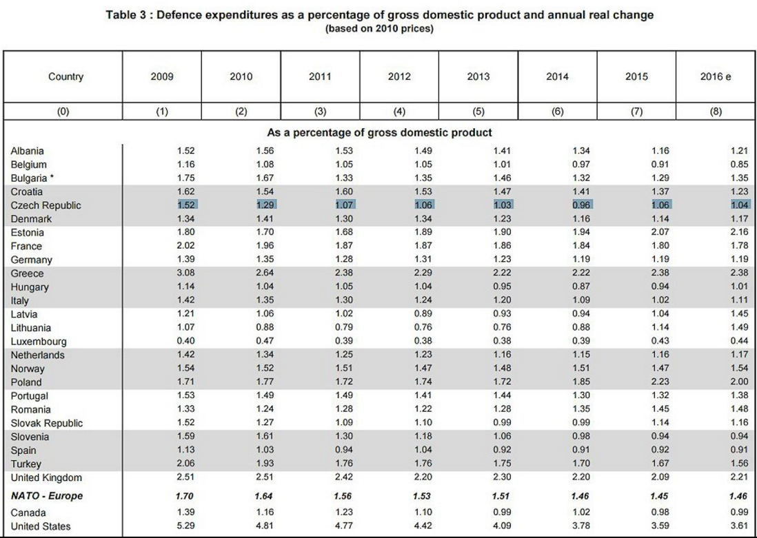 Ačkoli náš stát ústy zvolených vlád deklaroval obchodu vyčlenit stanovená 2 % na obranu již v roce 2002, stalo se tak prakticky jen jednou. Hned na začátku. Tehdy to bylo dokonce více. Celých 2,23 %. V dalších letech vojenský rozpočet klesal přes 1,55 % až na neuvěřitelných 0,96 % v roce 2014. ČR tak padla mezi státy zapojené do NATO do té horší části pelotonu. A to za situace, kdy různé reformy ozbrojených sil zredukovaly českou armádu na malý expediční sbor profesionálů o velikosti asi tak jedné divize. Bez spojenců jsme se stali prakticky neschopní bránit svoje území.