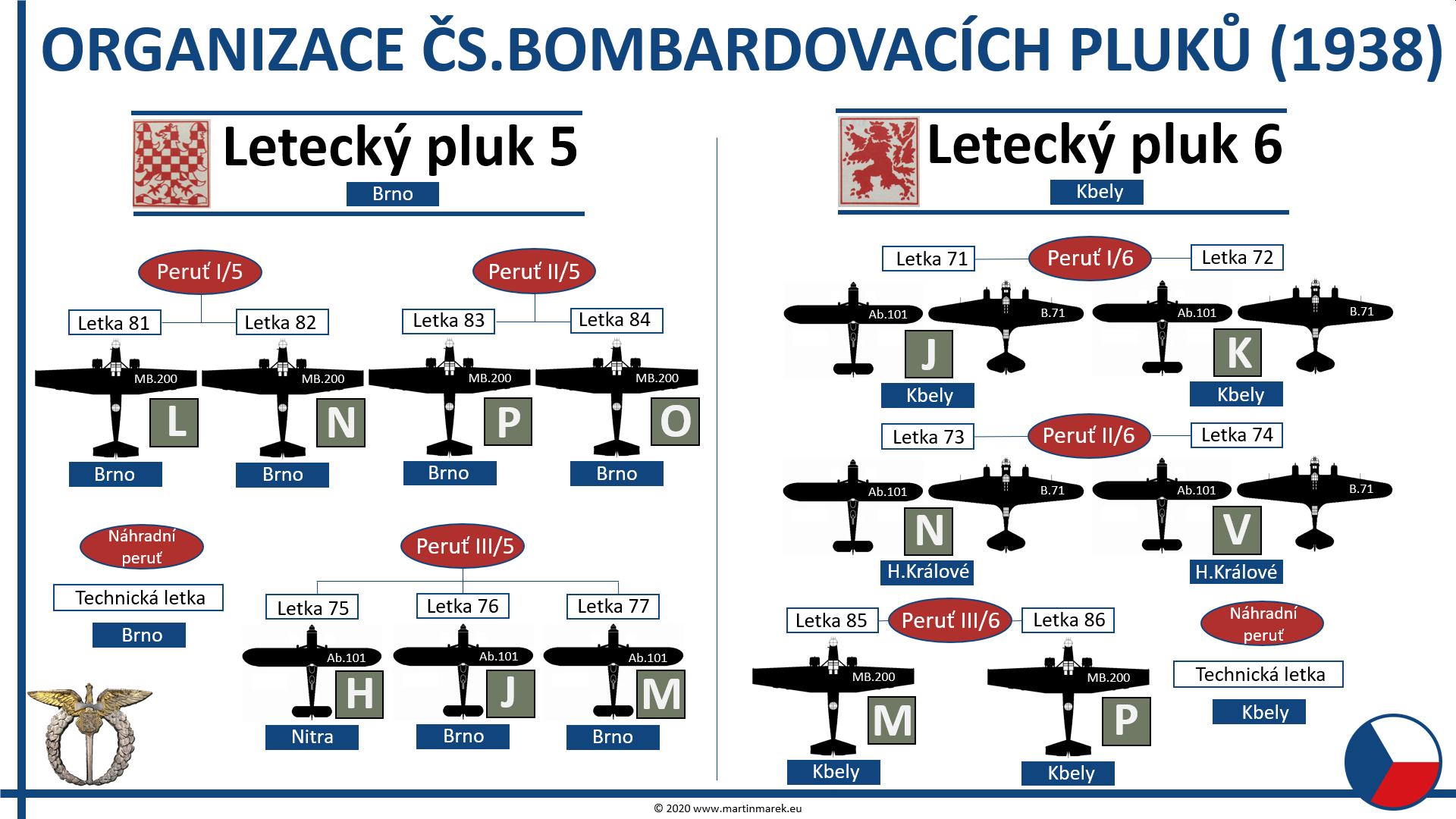 Jako první obdržel nová Aera MB.200 Letecký pluk 5 (4 letky) se základnou v Brně. Následoval Letecký pluk 6 (2 letky), sídlících v Kbelích. Spolu s MB.200 byly v letkách obou pluků ještě další stroje. Jednalo se především o Area Ab.101, tedy o nástupnickou variantu nepříliš povedeného Aera A.101 - odlišovaly se hlavně použitým motorem. Jejich bojovou hodnotu v roce 1938 nelze nazvat jinak než tragickou. Druhým typem byla výše zmíněná licenční AVIA B.71, představující pravděpodobně to nejlepší, čím naši letci disponovali. Organizaci obou pluků vyjadřuje grafické znázornění.