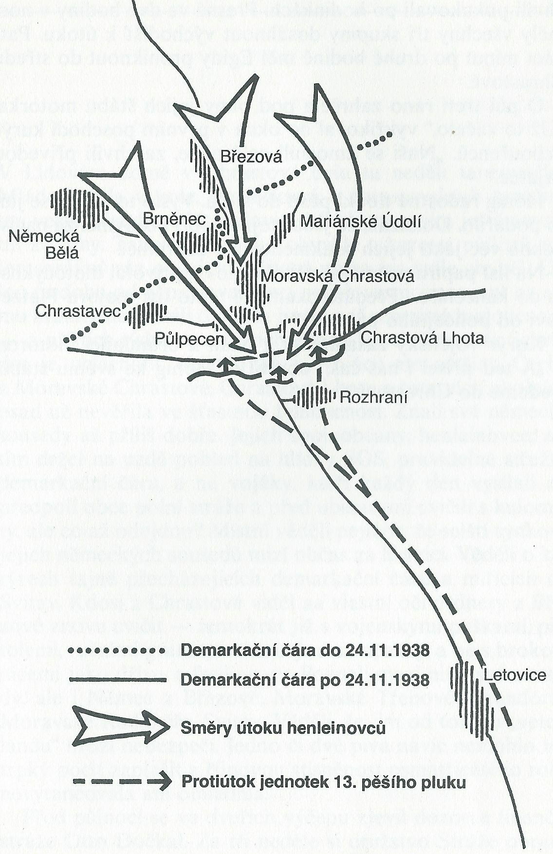 V Moravské Chrastové se odpočívalo po místní tancovačce. Kromě stráží bojujících s dušičkovým chladem byly ulice liduprázdné. Noční hlídka družstva SOS na státní silnici od Lidového domu po demarkační čáru připadla na policejního strážníka Eduarda Hluštíka a vojína Vladimíra Reibla z vojenské posily. V obci procházel hlídkou četnický strážmistr Josef Krempl. Před vojenskými ubikacemi měla armáda vlastní hlídky a v okolí se pohybovala dvoučlenná hlídka finanční stráže. Necelá desítka strážných vůbec neměla tušení o několika stovkách uchvatitelů blížících se tmou. Jako první je spatřil zednický polír Trtílek vracející se z taneční zábavy. Na silnici vedoucí od Mariánského údolí si všiml hustých rojnic postupujících na Chrastovou. Nezmohl se ani na drobný odpor a stal se prvním zajatcem henleinovců. V té době noční ticho přerušil zvuk dvou těžkých nákladních aut. Překročily demarkační čáru směrem od Březové. Zastavily u Lidového domu. Jejich osádka prakticky ihned odzbrojila dozorce Finanční stráže Dočkala. Zhruba padesátka ordnerů v doprovodu pětice říšskoněmeckých policistů následně obklopila Lidový dům, vnikla dovnitř a dokonale překvapila spící skupinu příslušníků Finanční stráže. Útočníkům padla do rukou výzbroj, munice, písemnosti i peníze. Další finančníci byli zajati na svých hlídkách. Jen dvěma strážcům se podařilo utéci k sousednímu oddělení a podat varování. Do zajetí padlo i celé družstvo SOS a osazenstvo četnické stanice. Se zajatci bylo mnohdy surově zacházeno. Násilností se účastnili především uniformovaní příslušníci německé policie. Zajatci byli téměř ihned odváženi za demarkační čáru. Tento osud potkal i některé občany české národnosti. Třešničkou na dortu se mělo stát odzbrojení vojenských jednotek. A to se také z velké části podařilo. Velkou zásluhu na tom měl rozkaz, který zakazoval vojenským útvarům vézt palbu na uniformované příslušníky německé branné moci. Ordneři chytře nastrkovali do prvních řad policisty v uniformách. Zajali tedy větší počet vojáků včetně podporučíka Doležala. Získali značnou část výzbroje počítajíce v to kulomety. Zajetí unikl pouze štábní kapitán Krčmář, kterému se podařilo zburcovat zbývající četu vojáků ubytovaných v obci Rozhraní a urychleně podat telefonické hlášení na velitelství 13. pěšího pluku.