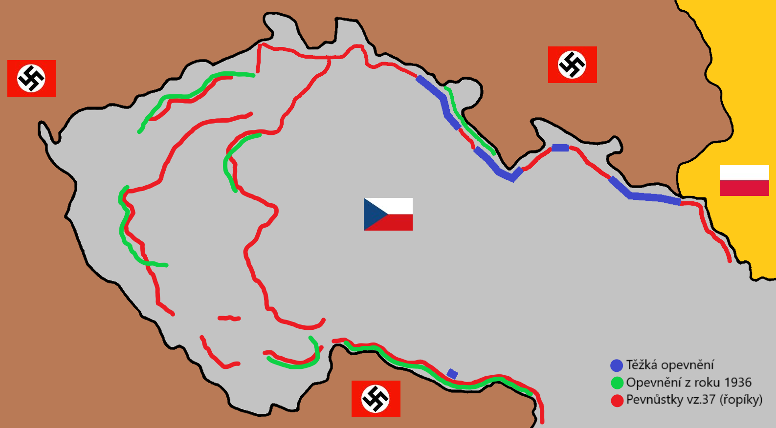Mapa stavu opevnění Čech a Moravy těsně před mnichovskou kapitulací. (2)
