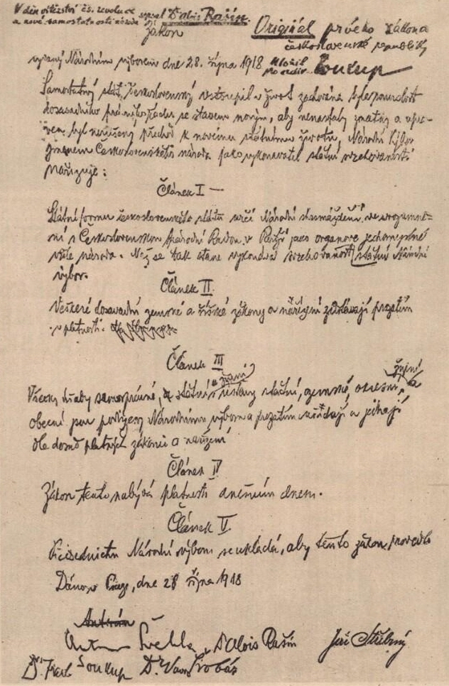 Dokument obsahuje pět zásadních bodů. Začíná větou: „Samostatný stát československý vstoupil v život.“. Také signatářů je rovných pět. Vyjma zmíněného Aloise Rašína ještě Antonín Švehla, Jiří Stříbrný, František Soukup a Vavro Šrobár. Na scéně se objevily ozbrojené oddíly Sokolské stráže, jako dočasná bezpečnostní složka ČNV. Kromě nich do služby vznikající republiky nastoupili členové dalších tělocvičných a branných spolků, včetně vojáků českého původu. Ve večerních hodinách se shromáždili na pražském Žofíne, kde pod vedením Jaroslava Rošického došlo k ustavení vojenských struktur ČNV. Do města vyrazily pořádkové hlídky.