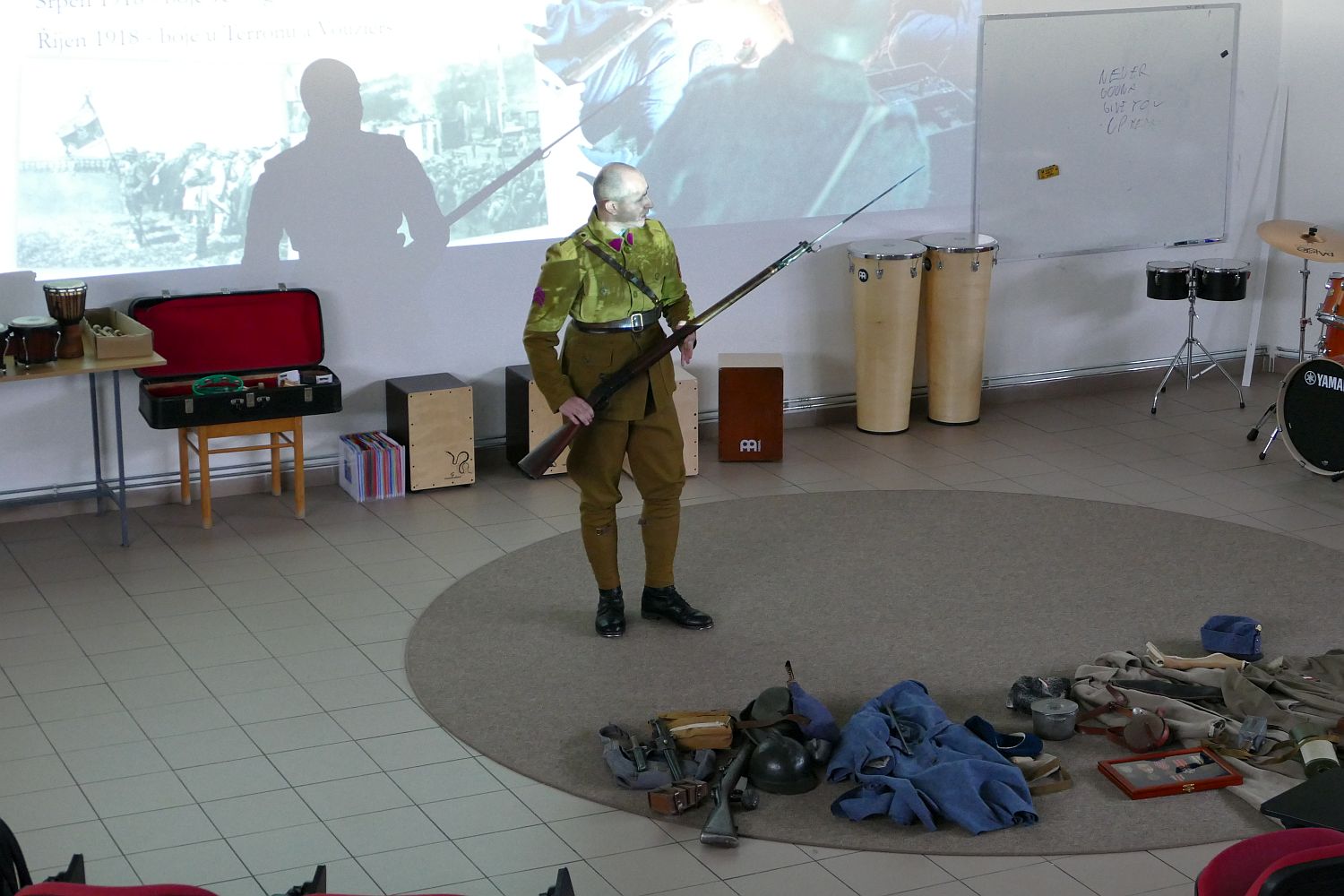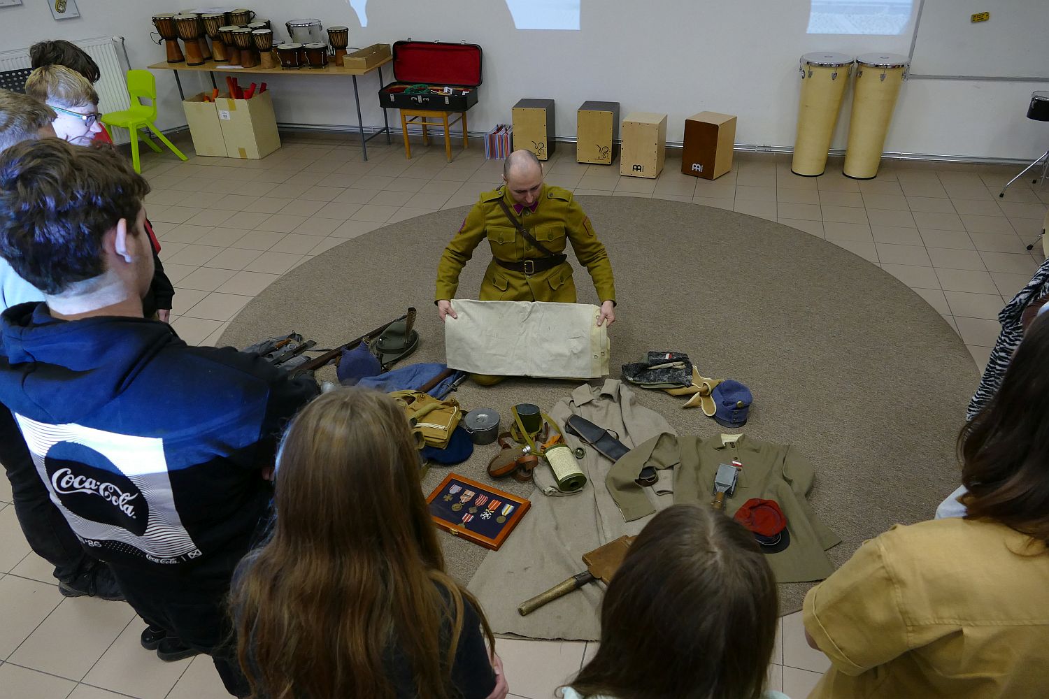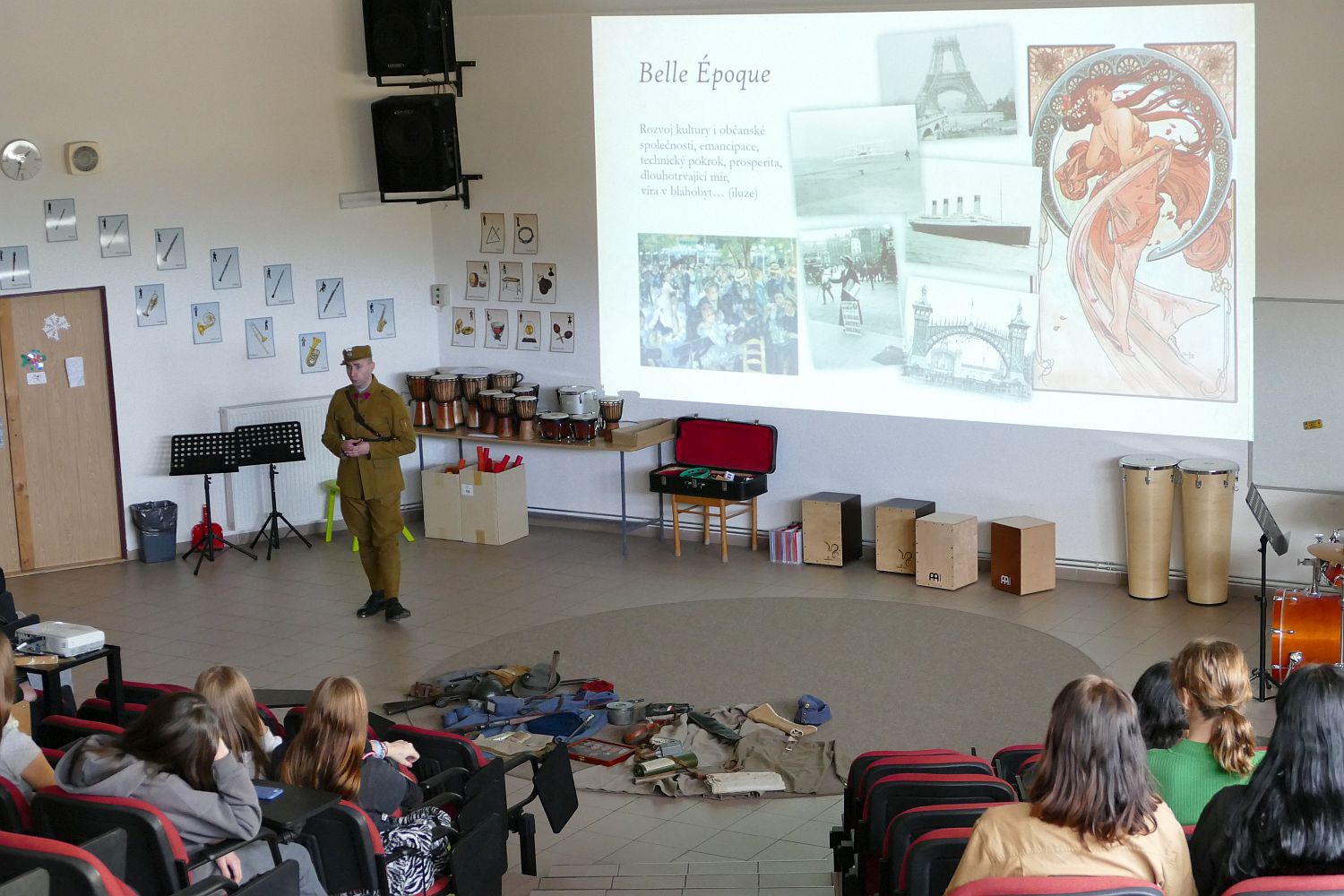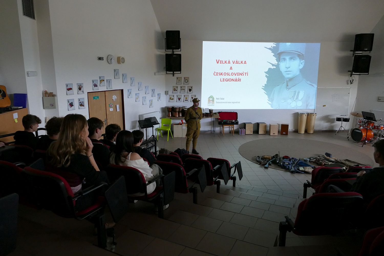 Přednáška se konala v moderní posluchárně a hudební učebně s možností velkoformátové projekce. Než se řeč stočila k samotným legiím v Rusku, Francii a Itálii, došlo na hlubší seznámení s historii prvního válečného konfliktu světového rozsahu. Ten postihl každou rodinu obývající tehdejší Rakousko-Uhersko. Žáci byli seznámeni i s dobovými reáliemi z nedaleké Plzně a okolí.
