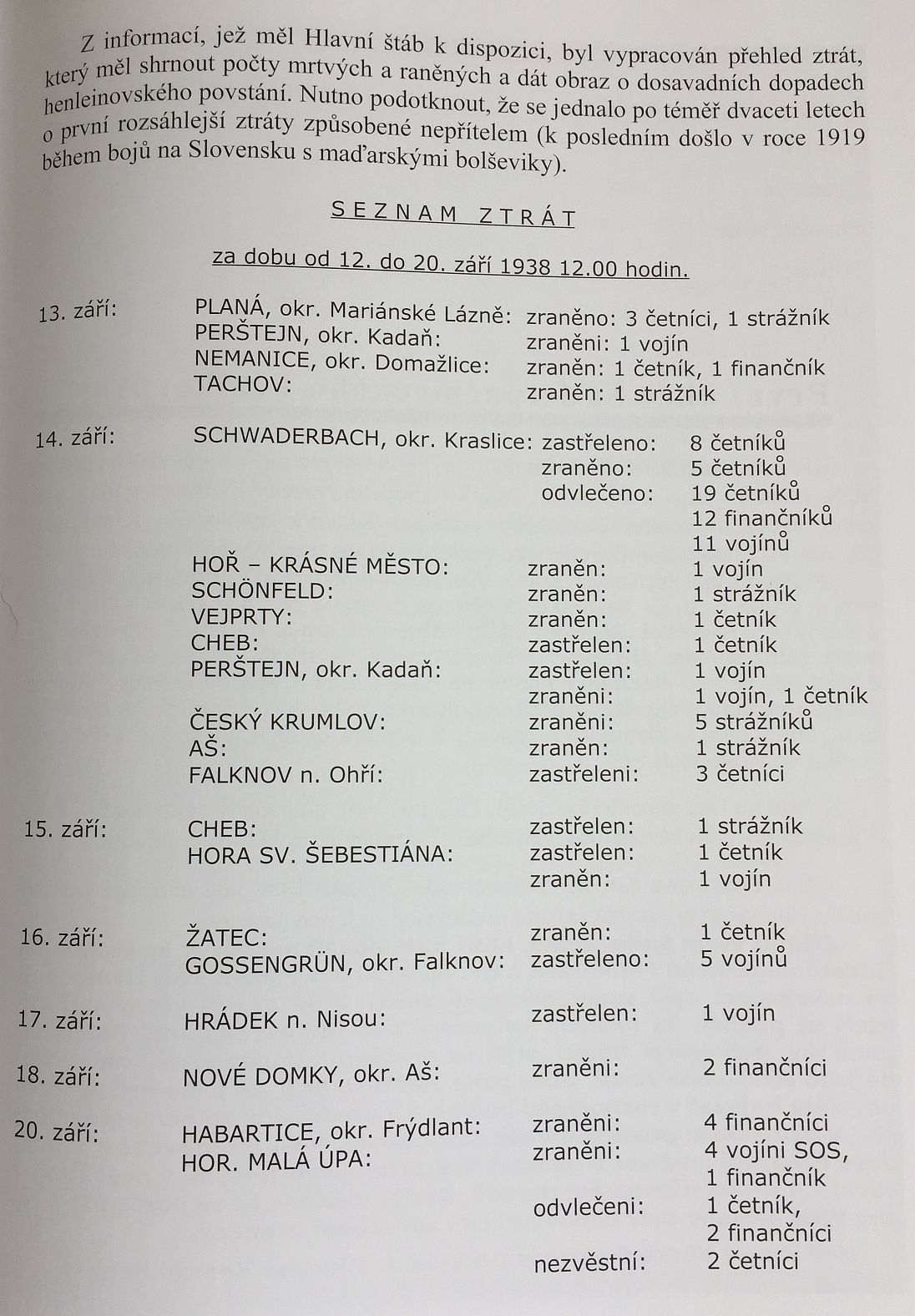 Závěrečné části jsou věnovány událostem po mnichovské dohodě. Z textu si lze například odvodit, že vláda přistoupila k cenzuře zveřejňovaných informací. Skandální výsledky konference pro R.Č.S. byly tentokrát obyvatelstvu vyložené dávkovány. Především z obavy před podobným vývojem jako po první kapitulaci z 21.9.1938. Zde se shledáváme s dalším zajímavým dojmem. Vyloženě vzniká kontrast mezi benevolentním přístupem státní moci k Němcům a daleko přísnějšímu postupem vůči českému občanstvu. Jedna ze závěrečných kapitol se podrobně věnuje odstupování pohraničí. Samozřejmě se nevyhýbá dvěma doloženým faktům. Davovému vítání říšské moci a exodu českého obyvatelstva, prchajícího do vnitrozemí okusované republiky. Jedna celá kapitola je věnována ztrátám ozbrojených složek a civilistů. Obsahuje jmenný výčet. Knihu uzavírají podpůrné informace. Především přehled změn názvů obcí po roce 1945. Dále seznam zkratek a pramenů.