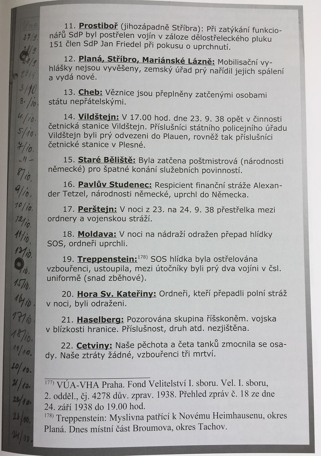 Publikace Miloslava Svitáka mapuje události od 12. září 1938 do 11. října 1938 pohledem zpravodajského oddělení I. sboru. Popisuje velmi kritický okamžik naší státnosti. Sleduje den po dni vývoj v oblasti západních a jižních Čech, především konflikty mezi čs. ozbrojenými sbory a sudetoněmeckými ordnery (Sudetoněmeckým Freikorpsem). Toto zaměření dává knize podtitul: "Incidenty mezi čs. jednotkami a henleinovci“. Čerpá z archivních materiálů, mnohdy ještě nepublikovaných. Kombinací vlastního textu, přepisů hlášení a přetiskem novinových zpráv se čtenáři dostává do rukou souhrnný materiál dokumentární povahy, který ovšem neztrácí čtivost. Zajímavé fotografie celkový dojem podtrhují. Nechybí přetisky dobových map. Jejich vypovídací schopnost je někdy omezena velikostí. Autor doplnil text poznámkovým aparátem s upřesňujícími daty nebo odkazy na zdroje informací. Zpracování publikace je kvalitní. Přebal z tvrdého papíru černé barvy dává vyniknout písmu v červené barvě písma – barvě krve, přičemž jeho titulní straně vévodí litinový znak republiky, jaký byl na pohraničních sloupech až do likvidace státu v jarních měsících roku 1939.