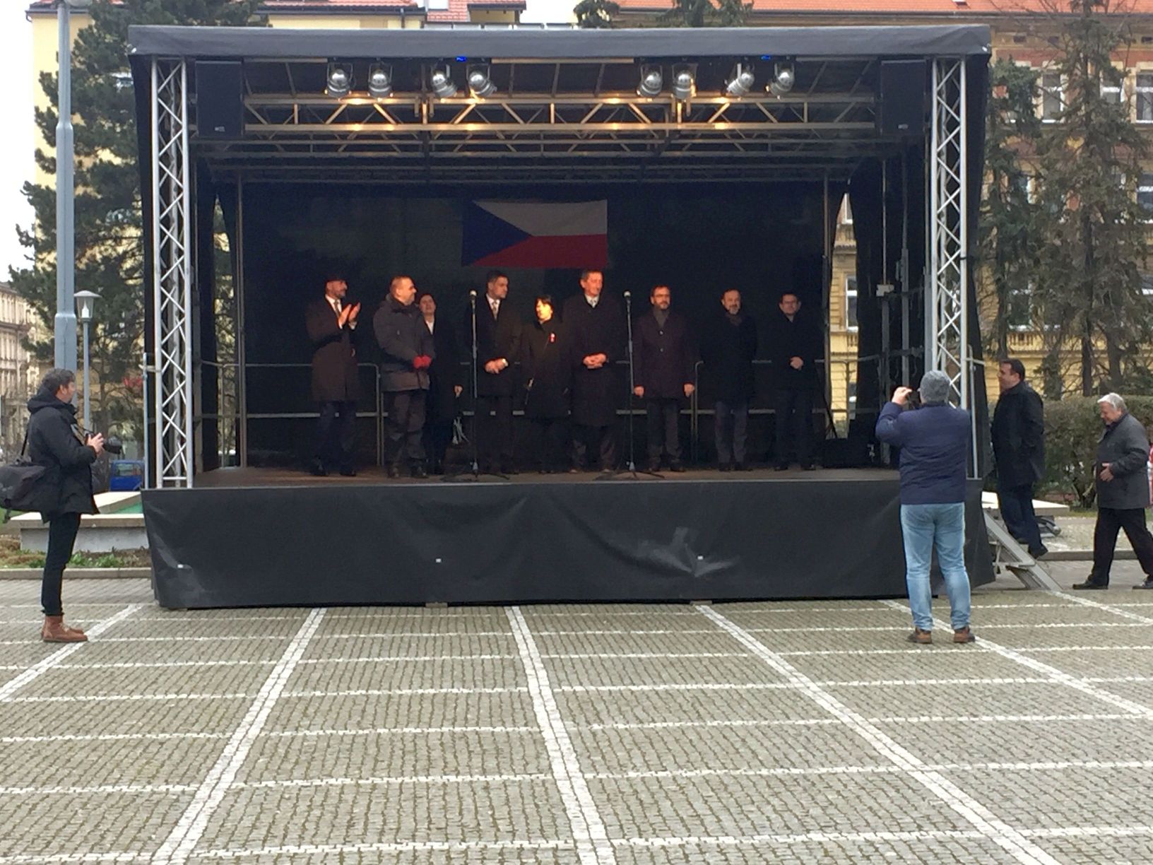 Politická reprezentace na krytém pódiu.