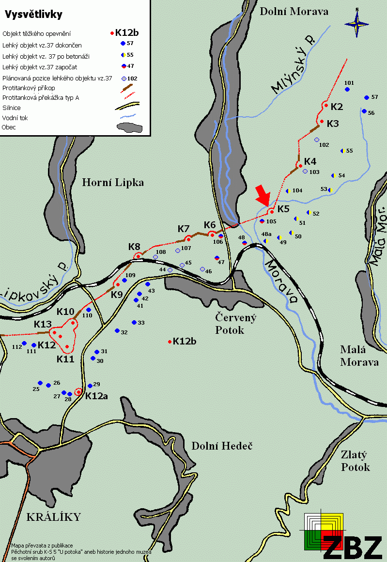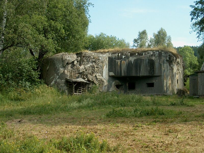 Následující den se náš program zcela změnil. Zatímco osádka K-S 5 pokračovala v dalších úpravách, my jsme využili naší přítomnosti v tomto zajímavém kraji a vydali se na bunkrologickou procházku. Od K-S 5 jsme po betonovém prahu došli až k protitankovému příkopu, za kterým se tyčí poničený srub K-S 4 „ U cesty“.