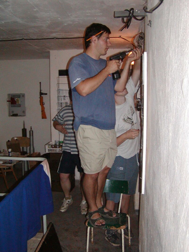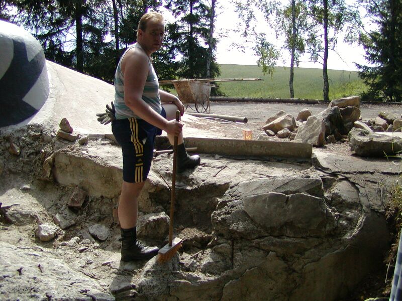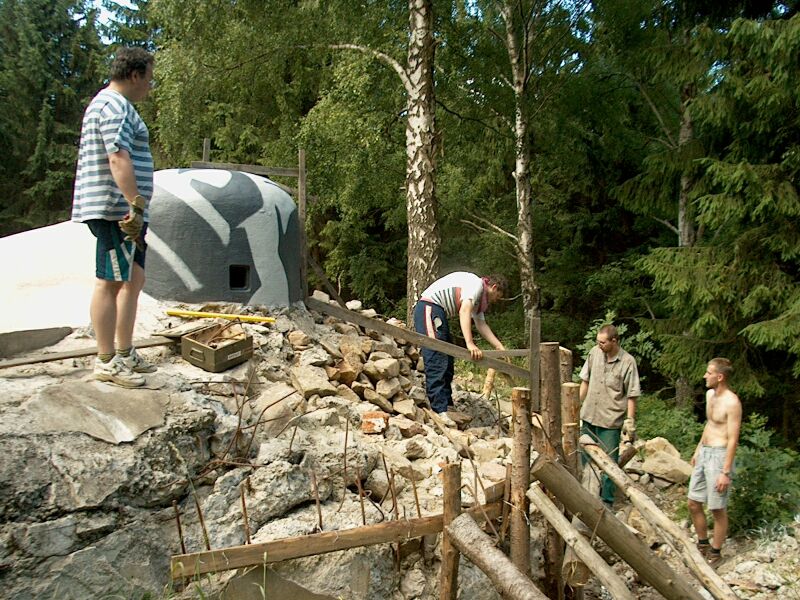 Druhý den začal nutným úklidem některých místností. Jednalo se především o místa navštěvovaná v rámci prohlídek. Přes noc posloužila jako provizorní ložnice. Po vydatné snídani přišla příprava dvou nejdůležitějších úkolů dne. Betonáže kolem středového zvonu pro těžký kulomet a opravy dalších místností. Nejprve jsme se s Martinem Stupkou rozdělili. Mým úkolem bylo vysušení chodby a prostoru pod zvonem, u kterého měla probíhat betonáž. Martin pomáhal venku. Asi po půl hodině jsem dokončil svěřenou práci a přidal se ke skupině na střeše srubu. Tam bylo nejvíce rušno kolem betonové makety, nahrazující původní zvon z ocelolitiny. K-S 5 potkal podobný osud, jako některé další těžké objekty. Neušel pozornosti pracovníků národního podniku Kovošrot. Na sklonku padesátých let došlo k odstranění pancéřových zvonů odstřelem. Tyto unikátní prvky našeho opevnění nenávratně zmizely v nenasytném chřtánu hutí. Vlastní pevnosti zůstaly zcela zmrzačené, s hlubokými ranami. Díky tomu podlehl interiér postupné devastaci. Pronikající vlhkost a činnost obyvatelstva z okolí udělaly své. Rekonstrukce srubu musela vyřešit dvě věci - uzavření a následnou restauraci zničených partií. Uvedení do původní podoby ovšem není zdaleka jednoduché. Nejprve se musí vyřešit chybějící pancéřový díl. Potom dobetonování vnějšku. Na K-S 5 to již jednou výborně zvládli. Při opravě levého křídla osadili maketu zvonu pro lehký kulomet z betonu a provedli kompletní dobetonování křídla.