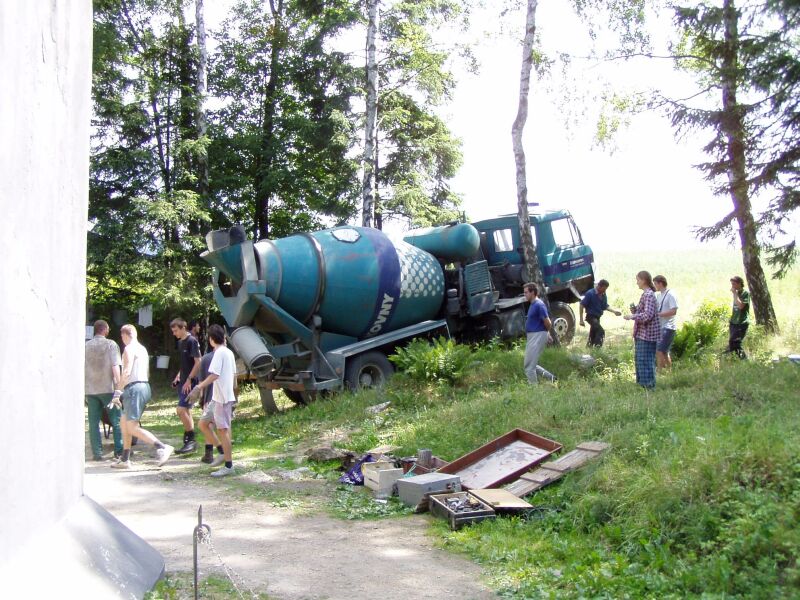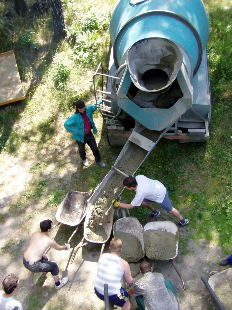 Přesně v jedenáct hodin přišel na řadu oběd v podobě pikantního gulášku a vynikajícího domácího chleba. Následoval odpočinek spojený s čekáním na příjezd míchačky s betonem. Ta dorazila na místo chvíli po dvanácté. Dvacítka lidí se rozdělila na tři skupiny. Podavače materiálu, betonáře a kolečkáře. Martin Stupka i já jsme se zařadili do posledně jmenované.