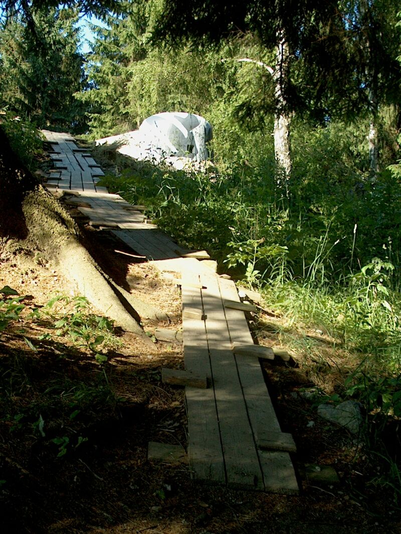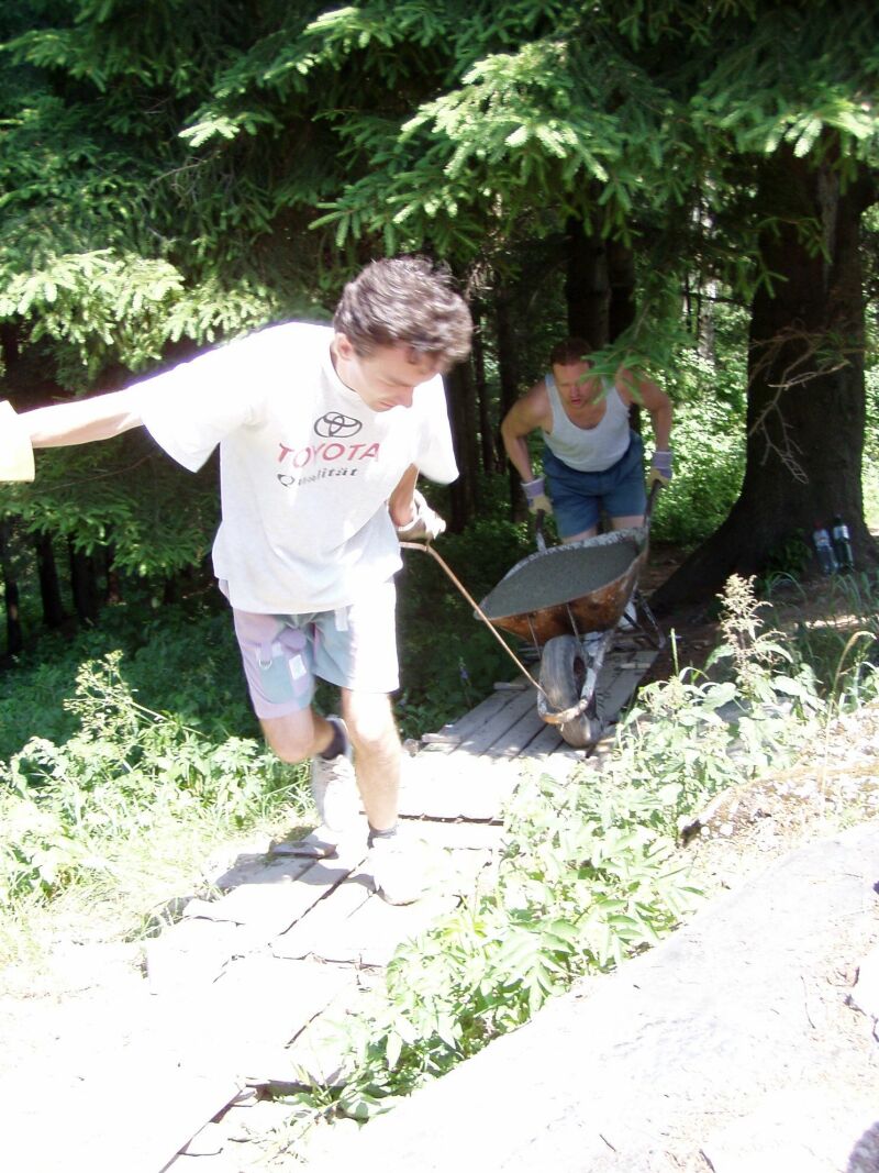 Nyní bylo nutné dojet k pravému křídlu a rozběhem zdolat malý, ovšem o to prudší kopeček s ostrou zatáčkou doleva. Pokud se to povedlo, čekal na místě pomocník s hákem. Jakmile se zahákoval, nastala finálová fáze, běh s kolečkem po svažitém záhozu až na střechu srubu. Při tom se musela dvojice trefit do poměrně úzké dráhy z prken. Dále se kolečka rozdělovala k vyprázdnění podle potřeby. Samozřejmě se přeprava betonu neobešla bez drobných nehod. Sem tam někdo nevybral ostrou zatáčku a mířil si to s nákladem do lesa. Došlo k několika uklouznutím i k vysypání části obsahu. Většina kolečkářů zůstala u svého úkolu až dokonce. Občas došlo k výměně rolí. Voziči se vyměnili s pomocníky. Po své dávce koleček jsme se také my dva nechali vystřídat.