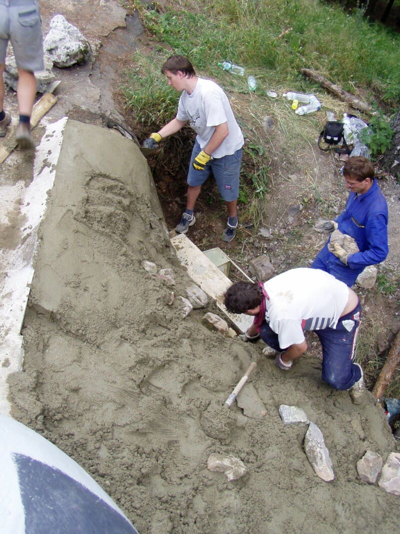 To samé se nyní odehrávalo ve středové části. Maketa byla již dříve usazena na svoje místo včetně nezbytné fixáže betonem. K dokončení bylo potřeba vybetonovat chybějící části. Veškeré přípravy se proto zaměřili na výstavbu bednění, skládání potřebného kameniva a čištění zbytků původních stěn od nečistot. Zatímco Martin Stupka pomáhal s bedněním, já jsem se nejprve přidal ke skupince nosičů kamení. Když bylo materiálu dost, přešel jsem na čištění stěn. Pomocí drobných nástrojů jsem odstraňoval mech, náletové traviny i hlínu z prasklin. Vcelku pohodové tempo dopoledních prací bylo předzvěstí intenzivní námahy, která měla přijít odpoledne.