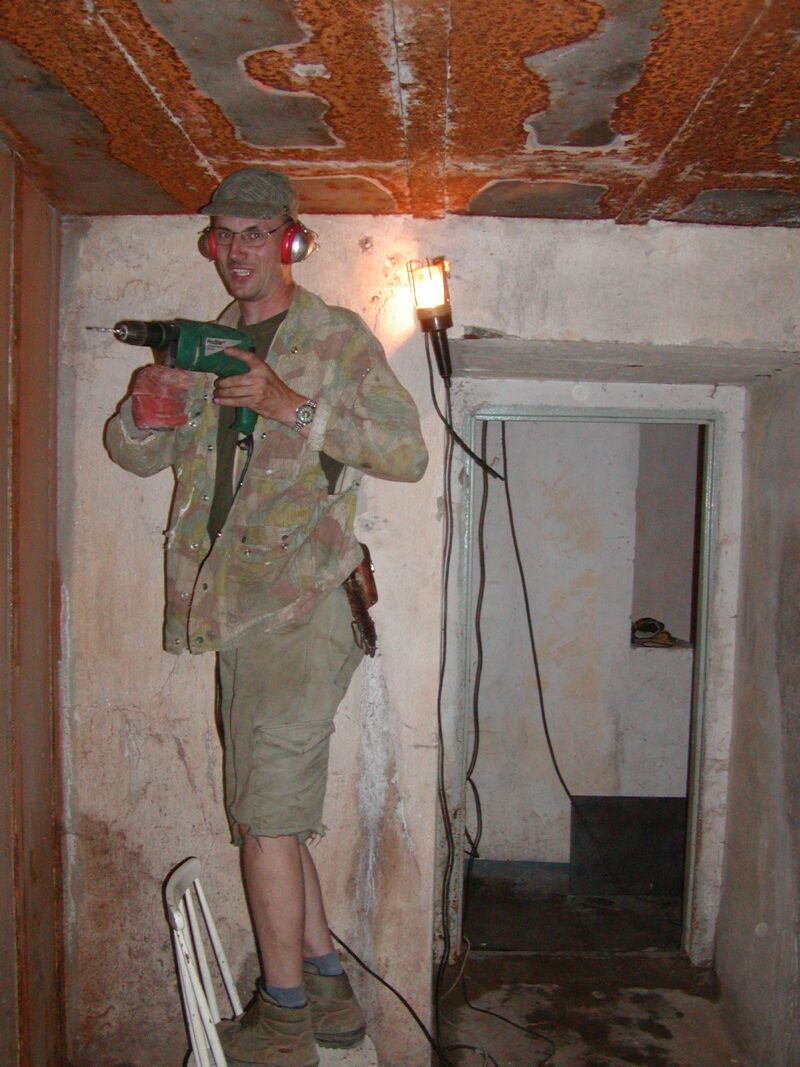 Kromě vnějších oprav probíhaly práce také uvnitř objektu. Snaha se soustředila na původní místnost ubikace pro poddůstojníky. Bylo do ní zavedeno elektrické osvětlení. Oplechování stěn se muselo broušením zbavit koroze a důkladně natřít syntetickou barvou. Zatímco u lidí pracujících venku vymalovalo pražící slunce na nechráněné pokožce rudé reliéfy, kolegové uvnitř se museli vyrovnat s prachem a výpary. Horší byly bezesporu výpary z barev. Jejich působení v uzavřeném prostoru nemělo daleko ke skutečné toxikomanii.