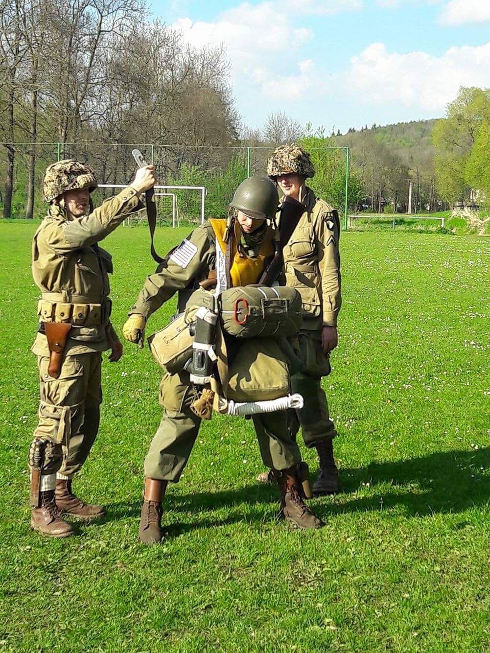 Odpolední program začal zlatým hřebem. Seskokem čtveřice výsadkářů v historických uniformách. Krátce po druhé hodině se nad Štěnovicemi objevil legendární dvouplošník An-2. Přiletěl z letiště v Líních. Po několika okruzích opustili  jeho útroby čtyři parašutisté a vydali se na kruhových padácích směr hřiště kopané. Jejich sestup ovšem přinesl nečekané drama. Dvěma z nich se podařilo v celku bez problémů přistát. Druhá dvojice takové štěstí neměla. Nejprve poryv větru zanesl jednoho z výsadkářů do stromů za hřištěm. Parašutista byl bezpečně na zemi, nicméně padák se zachytil ve větvích. Na pomoc s vyproštěním ochotně přispěchala přihlížející „německá soldateska“. Ten druhý zachytil o vršek jednoho ze stromů. Ulomil ho a výsadkář jen o vlásek minul mlýnskou strouhu i kovové zábradlí hrací plochy. O hodinu později mohli diváci sledovat ukázky různých druhů palných zbraní z druhé světové války. Předvádění doprovodila samozřejmě patřičná zvuková kulisa. Po zhruba dvacetiminutové přestávce přišla na řadu další vskutku netradiční exhibice. Postupně byla provedena ukázka výsadkářské výstroje z druhé světové války armád V.Británie, USA a Německa. Parašutisté byli postupně oblékáni. Každý krok obdržel příslušný komentář pro diváky. Pro mnohé bylo množství výstroje i její váha velkým překvapením.