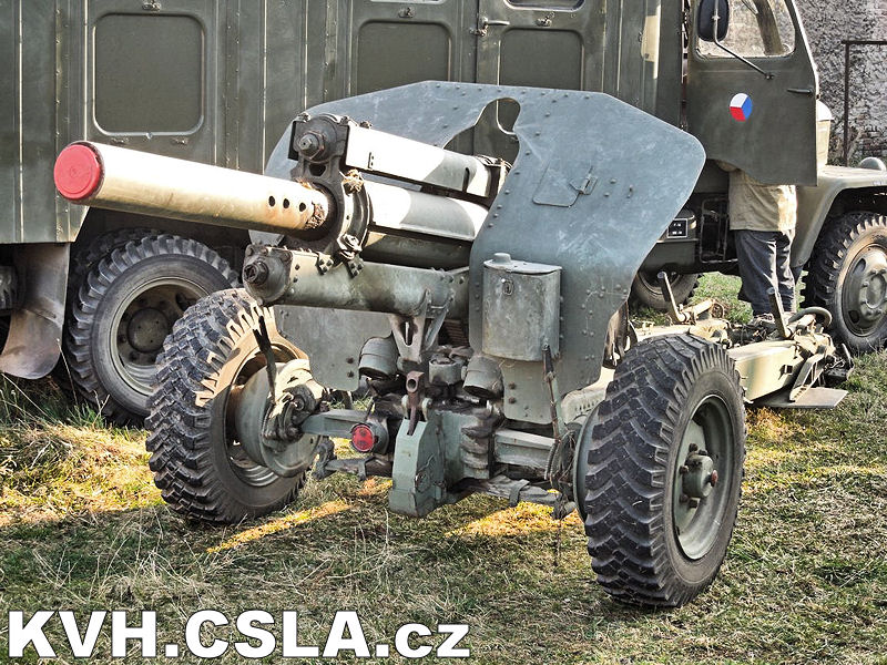 Zakoupená houfnice po přepravě do muzea v pozadí s legendární Pragou V3S