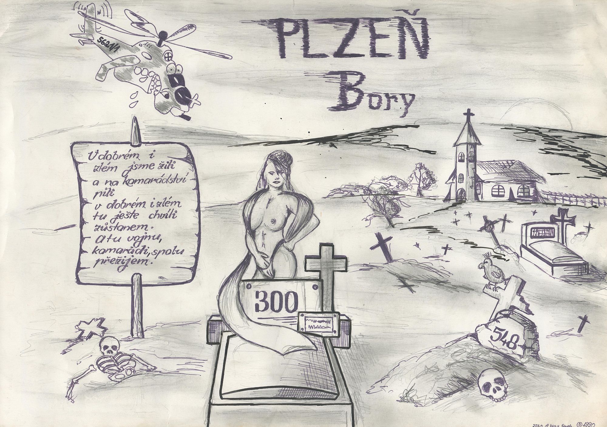 Ilustrace má rozměr 34 cm x 24 cm. Ústředním motivem je náhrobek s hodnotou tříset, za ním stojí postava ženy sahající si smyslně do klína. Celá scenérie je umístěna na hřbitov – kostry, náhrobky, kostel. Na pravé straně je náhrobek s číslem 548. V roce 1990 došlo ke zkrácení povinné vojenské služby na osmnáct měsíců. Výchozí hodnota dní do civilu se snížila z více než sedmi set na uvedených pět set čtyřicet osm. Vlevo nahoře se nachází informace o tom, kterým vojákům třístovka patřila. Kresba vrtulníku Mi-24 spolku s krycím číslem je jasná identifikace. Číslo obsahuje za lomítkem jedničku, což je první letka zmíněného vrtulníkového pluku. Ten měl v roce 1990 letky tři. Dvě – první a druhá – byly vyzbrojený bitevními vrtulníky Mi-24, třetí dopravními Mi-17. Jak k množení mohlo dojít není těžké odhadnout. Buď museli vojáci využít služeb některého civilního podniku – tehdy známá Fotografia v.d.– případně najít pomoc v rámci útvaru. U leteckého pluku se přímo nabízel tzv. SOK, tedy skupina objektivní kontroly. Ta pro svoji činnost využívala fotografickou techniku. Prováděla mimo jiné množení pomoci nafocení. Stačilo najít ochotného příslušníka SOKu, nabídnout mu cigarety či lahev a množení mohlo proběhnout po odchodu vojáků z povolání ze zaměstnání.