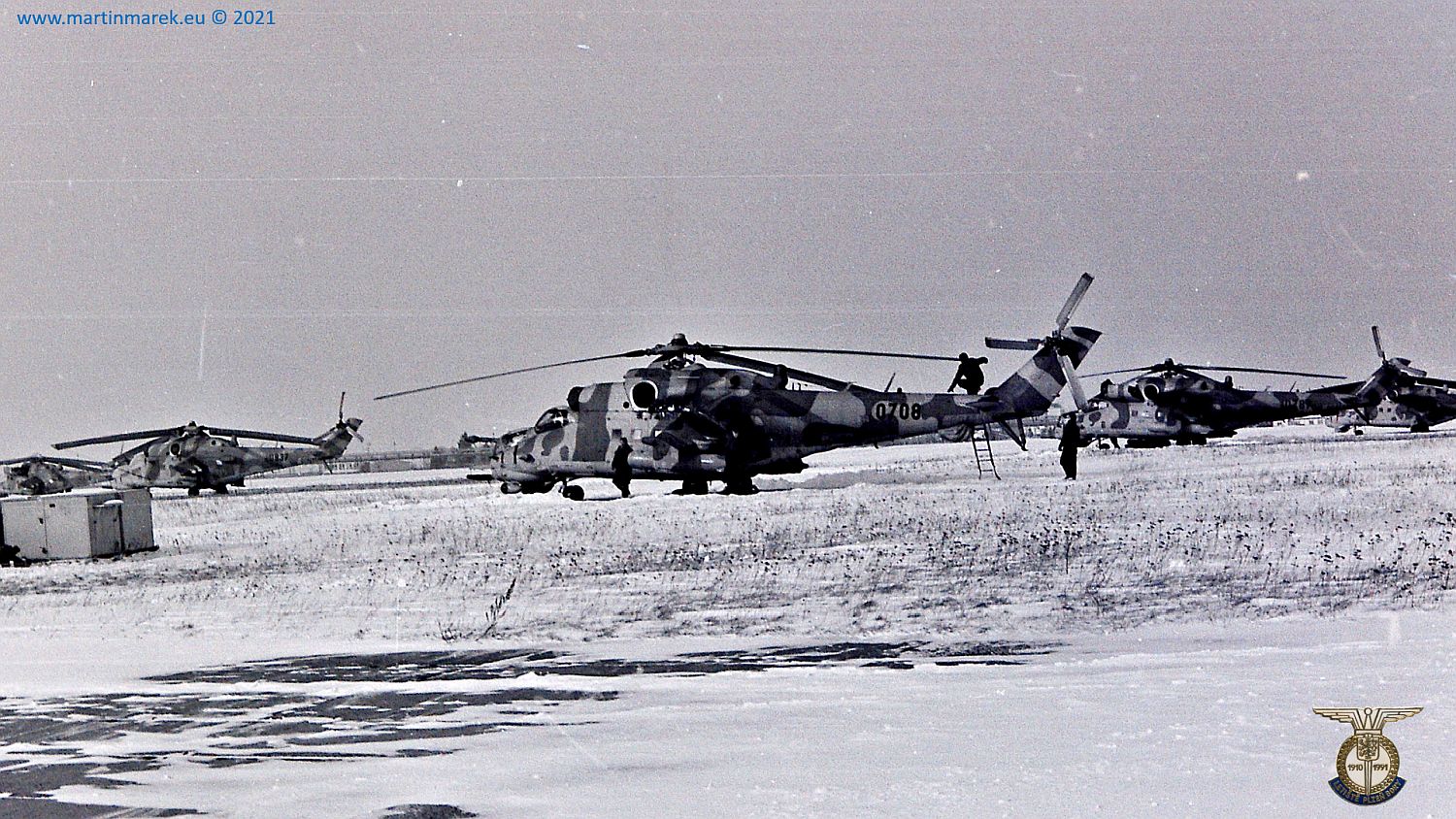 Stojánka vrtulníků Mi-24V na letišti Plzeň-Bory v lednu 1991
